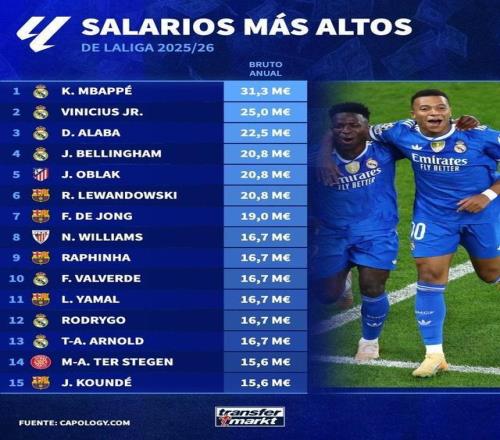 北京时间1月23日,德国转会市场官方列出了西甲球员税后年薪榜排名,其中皇马球员包揽前四,奥布拉克第五。