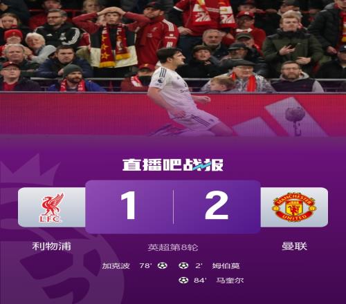 4连败+落后榜首4分!利物浦1-2曼联 姆伯莫闪击马奎尔制胜